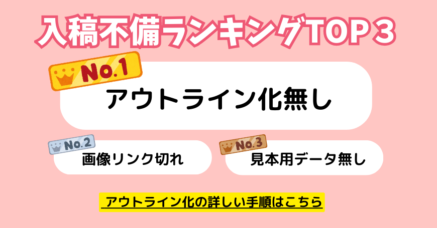 ご入稿データで、もっとも多い不備が「アウトライン化がされていない」ケースです。 「そもそもアウト…